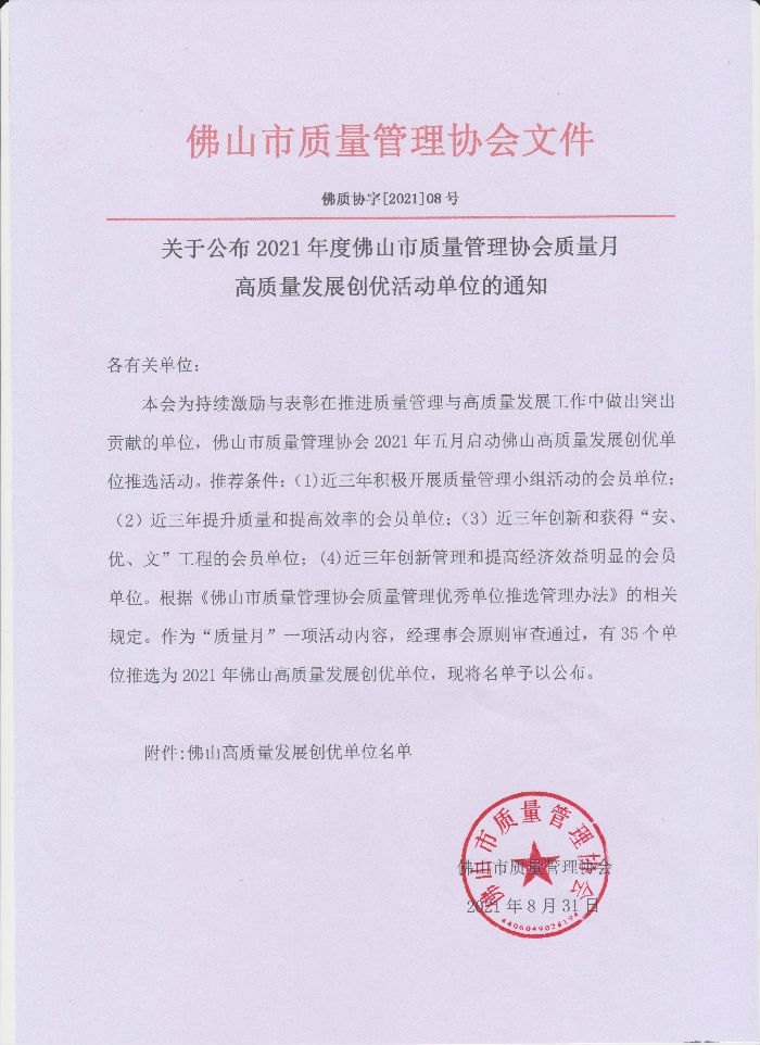 關(guān)于公布2021年度佛山市質(zhì)量管理協(xié)會(huì)質(zhì)量月高質(zhì)量發(fā)展創(chuàng)優(yōu)活動(dòng)單位的通知